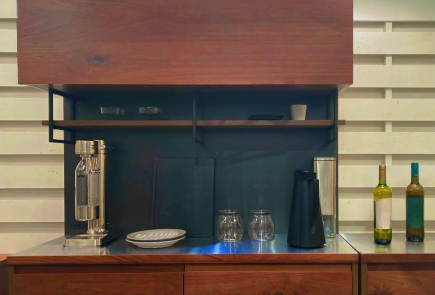 リビング奥の壁際にタイル貼りのバーカウンター+棚付きのグラスラックを設置。